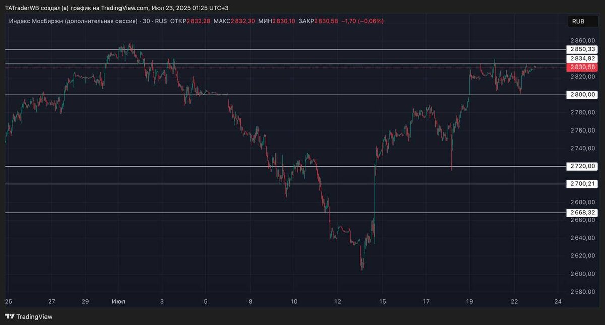 🧠 Вчерашняя, вечерняя торговая сессия пошла еще выше, тем самым усилив лонговость закрытия. Поэтому сегодня все также придерживаюсь лонгового плана. Цель роста по индексу 2840 - 2850. На приоритет от лонга смотрю Газпром, Алросу. Они наиболее сильно закрылись вчера. В целом, если позитив и продолжится, то есть все шансы увидеть и 2900, ближе к ставке, тем более, что выходят новости, про переговоры. Всем прибыльного дня! 🤝