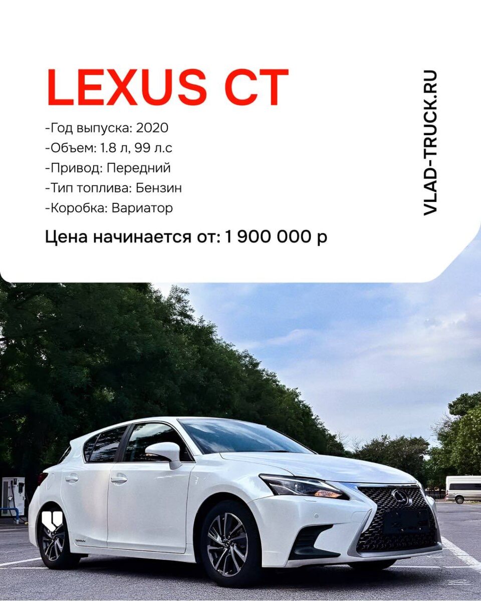 LEXUS CT -Год выпуска: 2020 -Объем: 1.8 л, 99 л.с Цены начинаются от: 1 900 000р. LEXUS ES -Год выпуска: 2022 -Объем: 2.0 л, 173 л.с Цены начинаются от: 2 900 000р. LEXUS UX -Год выпуска: 2020 -Объем: 2.0 л, 146 л.с Цены начинаются от: 2 200 000р. LEXUS NX -Год выпуска: 2022 -Объем: 2.5 л, 205 л.с Цены начинаются от: 3 500 000р. LEXUS RX -Год выпуска: 2022 -Объем: 2.0 л, 231 л.с Цены начинаются от: 3 900 000р. LEXUS LM -Год выпуска: 2022 -Объем: 2.5 л, 117 л.с Цены начинаются от: 13 900 000р. #автоизкитая@vlad_truck