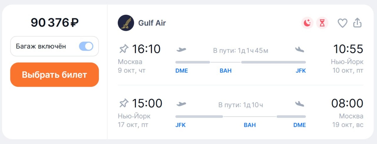 Для тех, у кого есть американская виза ➡️Gulf Air с 1 октября запускает рейсы в Нью-Йорк (JFK). Полеты будут по вторникам, четвергам и субботам, обратно – по средам, пятницам и воскресеньям. Маршрут будет обслуживаться на Boeing 787-9 Dreamliner. В агентской рассылке перевозчик обещает тем, кто полетит из Москвы в США, удобные стыковки в Бахрейне. Проверили: в октябре на пути в JFK стыковка при вылете из Москвы займет 5,5 часов, на обратной дороге – 15 часов. Билеты с багажом – от 90,3 тыс. руб. на одного. ➡️Есть варианты перелетов в Нью-Йорк с более короткими стыковками (2-3 часа) и не сильно дороже – у Turkish Airlines или Qatar Airways. Билеты в обе стороны с багажом – 101-102 тыс. руб. @atorus