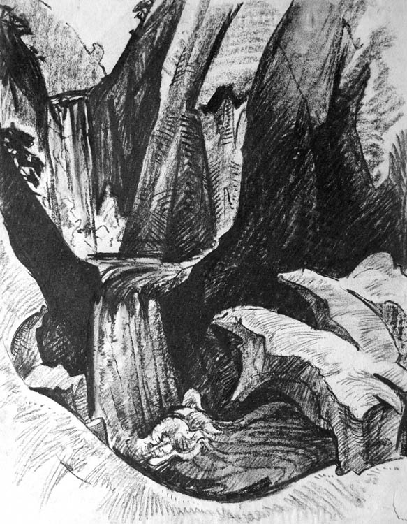 Водопада тугая струнка Как ожившая акварель. Прорвала бумагу рисунка И гудит, как сердитый шмель. Мы сегодня сделали дело У начала нашей земли. Заглянули вулкану в жерло. Зафиксировали. Дошли. Раскидав по плечам безделушки, Пляшут сопки. Древний обряд. У забора в пруду лягушки По-вечернему голосят. В. Г. Позигун. «Камчатка. Водопад» 1988 г. Галерея «Арт Владивосток»