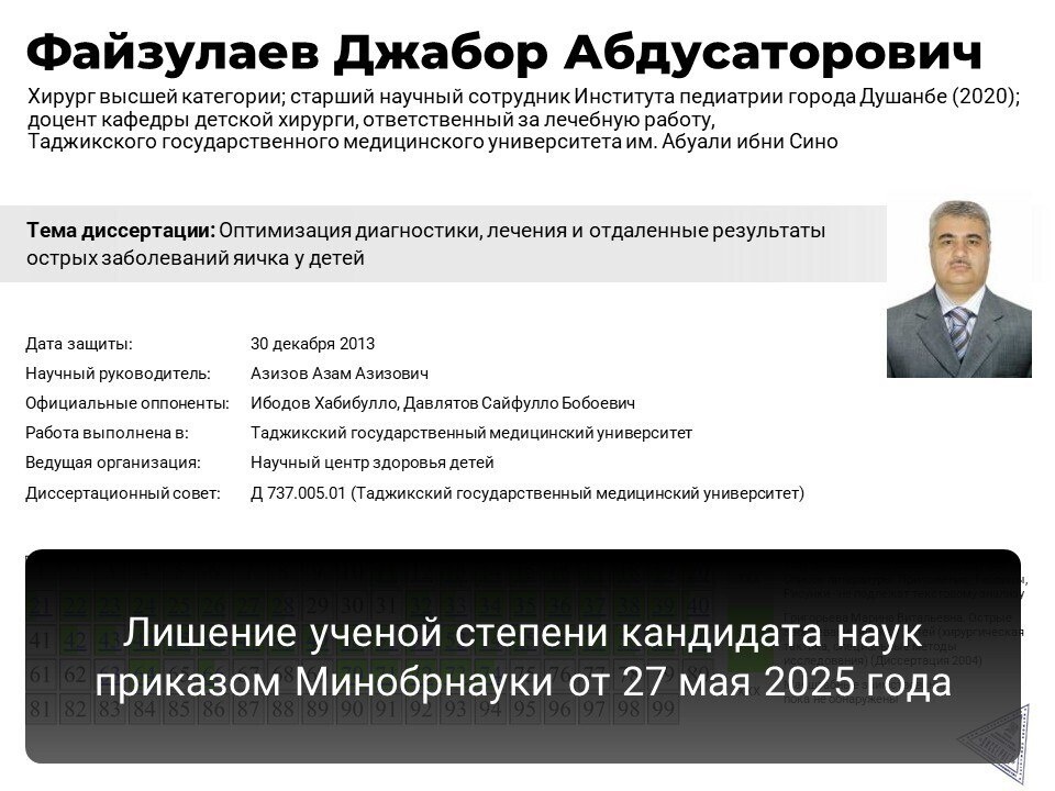 Файзулаев Джабор Абдусаторович, НЕ кандидат медицинских наук из #ТГМУ им. Абуали ибни Сино