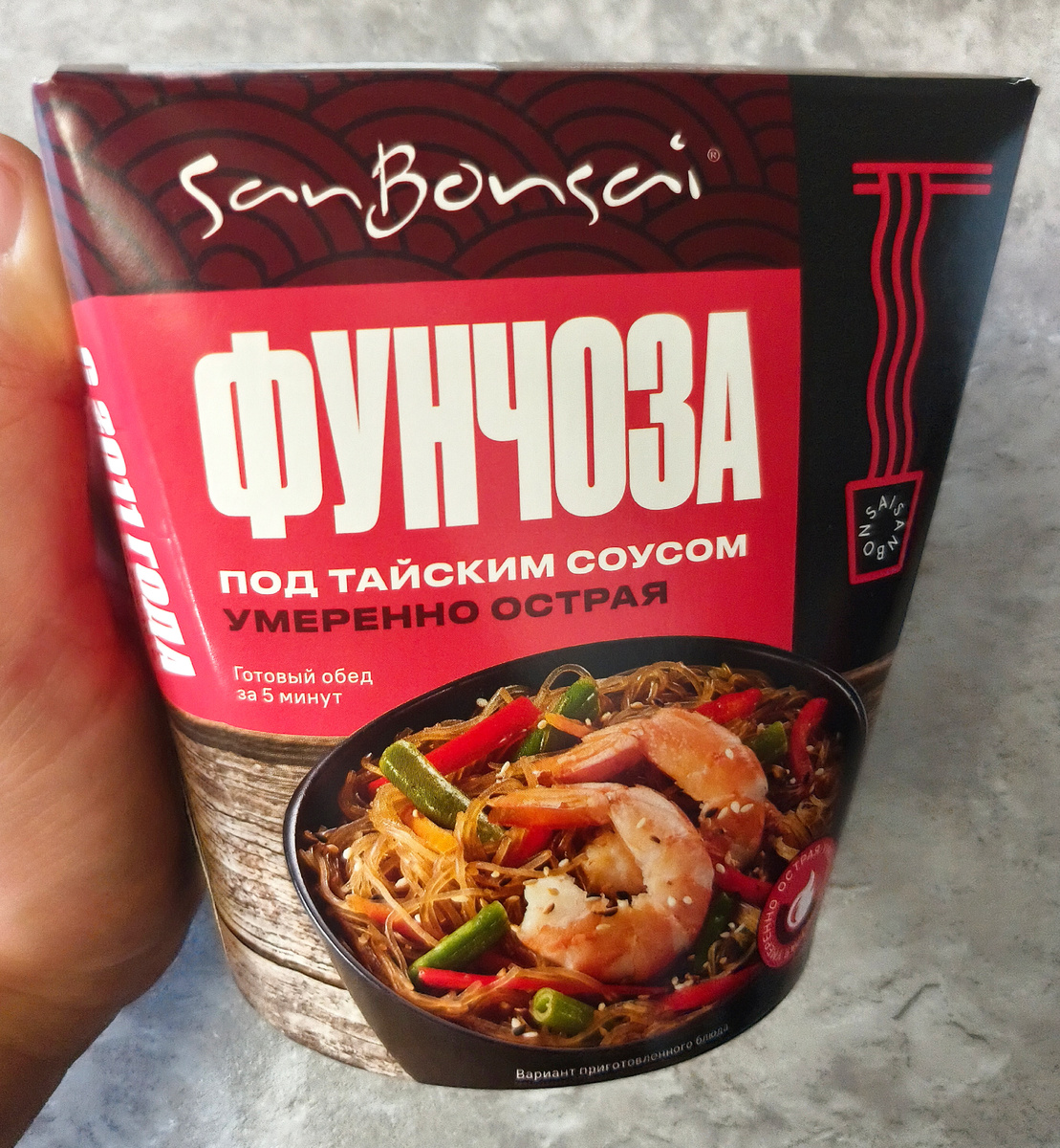 Всем привет! Сегодня пробую коробочку с фунсозой под тайским соусом бренда SanBonsai. Умеренно острая. Покупал в Ярче за 139 рублей. Мне кажется что-то подобное я видел в Светофоре. В составе фунчоза из зелёных бобов и гороха. Тайский соус. Он на основе грибов и морепродуктов. Ещё отдельно идёт соевый соус и семена кунжута. Это блюдо без бульона. В комплекте маленький брикет фунчозы. А вот с добавками не поскупились. Большой пакет ланчбокс соуса, также много соевого соуса и кунжута. Варю по инструкции. Реально, соуса здесь больше чем лапши получилось. Вот такая микропорция на выходе. Буквально только прикрыто дно упаковки. По вкусу ничего особенного. Получился вкус соевого соуса со сладостью. Остроты ноль. Никакого намека на грибы и морепродукты. Вообще это достаточно вкусно, но я ожидал большего. Ну и размер порции меня не удовлетворил. Сюда нужно как минимум три таких свёртка фунчозы. Ну и добавить грибов и морепродуктов. Было бы тогда вообще огонь. Всем приятного аппети