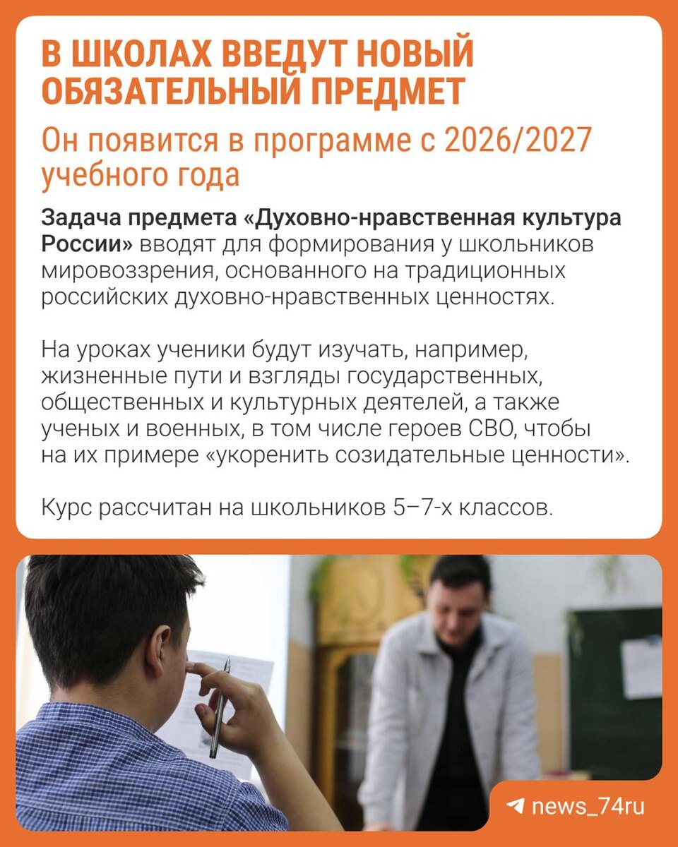 📚 В школах появится новый предмет С 1 сентября 2026 года ученики 5–7-х классов будут изучать предмет «Духовно-нравственная культура России». Из-за этих уроков придется изменить учебный план. А зачем предмет вводят, читайте в карточке ⬆️ В некоторых школах, кстати, такой урок уже есть. Но теперь станет обязательным для всех.