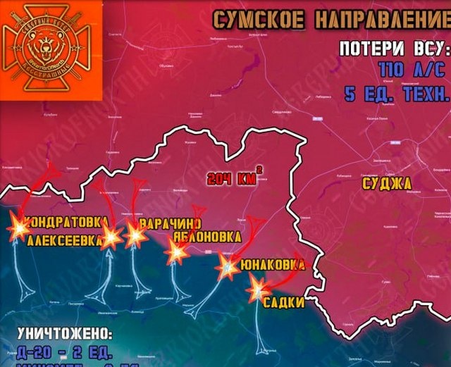 В группировке войск «Север» ВС РФ, которая продолжает создание полосы безопасности в Сумской и Харьковской областях Украины, отражая попытки прорыва ВСУ в Глушковский район Курской области, рассказали об изменениях текущей обстановки на линии фронта. На Сумском направлении в течение минувших суток 22 июля не прекращались ожесточенные бои возле Кондратовки, куда командование ВСУ продолжает отправлять на убой штурмовые группы, доукомплектованных из подразделений. ВС РФ завершают зачистку сел Варачино и Юнаковка Сумского района, противник выбит из опорных пунктов в прилегающих лесах. За сутки ВСУ предприняли четыре безуспешные контратаки: в окрестностях Яблоновки и села Садки, две — в Кондратовке. Они отражены российскими военными, противник вновь понес массовые потери, которые скрываются на Украине под списками «пропавших без вести». На Теткинском и Глушковском направлениях ВСУ не оставляет намерений просочиться на нашу территорию. Для поддержки штурмовых групп были переброшены на данный