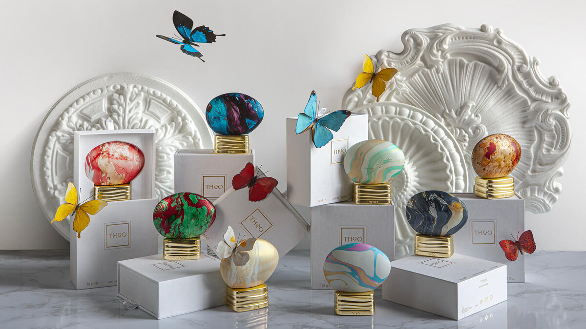 Форма флаконов у THoO узнаваема с первого взгляда: округлые, асимметричные, с мраморно-переливающимся рисунком. Каждый флакон покрыт вручную, что делает его неповторимым. Таким образом, визуальная часть становится не менее важной, чем содержимое. Упаковка — это не просто средство хранения, а часть замысла. THoO часто сравнивают с арт-объектами и даже ювелирными изделиями.