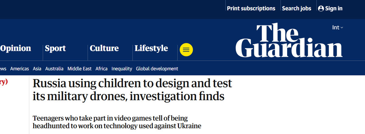 Британская The Guardian решилась на сенсацию. Давно журналисты этого именитого издания не будоражили трепетные душонки своей публики жуткими историями о не менее жуткой России. А тут такая тема... ...Расследование показало, что российские власти систематически привлекали детей к разработке и испытанию беспилотников для войны посредством общенациональных конкурсов, которые начинаются с невинных на первый взгляд видеоигр, а заканчиваются тем, что самых талантливых учеников нанимают оборонные компании. Эти разоблачения, ставшие частью расследования, проведенного находящимся в изгнании российским новостным изданием Insider, являются последним доказательством того, насколько активно российские лидеры вовлекают молодежь страны в военные действия, причем «патриотическое» и милитаризованное воспитание зачастую выливается в прямое участие... Итак, Россия глазами The Guardian. Авторская интерпретация публикации в британском таблоиде Представьте себе мир, где русские подростки вместо того, чтоб