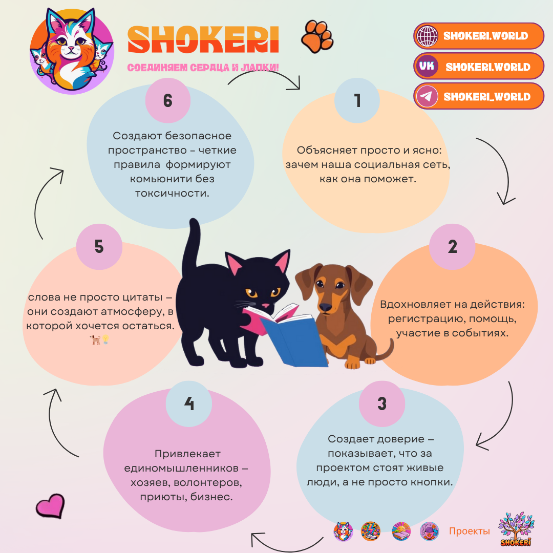 Пока у нас встала разработка, мы активно занимаемся над продумываем описания каждой страницы будущего сайта. Зачем? Потому что слова — это мостик между нами и теми, кто разделяет вашу любовь к животным. Хороший текст: 🔹 Привлекает единомышленников — хозяев, волонтеров, приюты, бизнес. 🔹 Объясняет просто и ясно: зачем ваша сеть, как она поможет. 🔹 Вдохновляет на действия: регистрацию, помощь, участие в событиях. 🔹 Создает доверие — показывает, что за проектом стоят живые люди, а не просто кнопки. 🔹 Снижают тревожность – многие темы (бездомные животные, болезни) эмоционально тяжелы. Добрые и аккуратные формулировки поддерживают, а не пугают аудиторию. 🔹 Объединяют разных людей – владельцы, волонтеры, бизнес говорят на разных языках. Грамотные тексты помогают найти общий язык и избежать конфликтов. 🔹 Повышают вовлеченность – юмор, тёплые истории или челленджи («Покажи своего питомца в смешной позе!») мотивируют чаще заходить в соцсеть и делиться контентом. 🔹 Подчеркивают миссию –