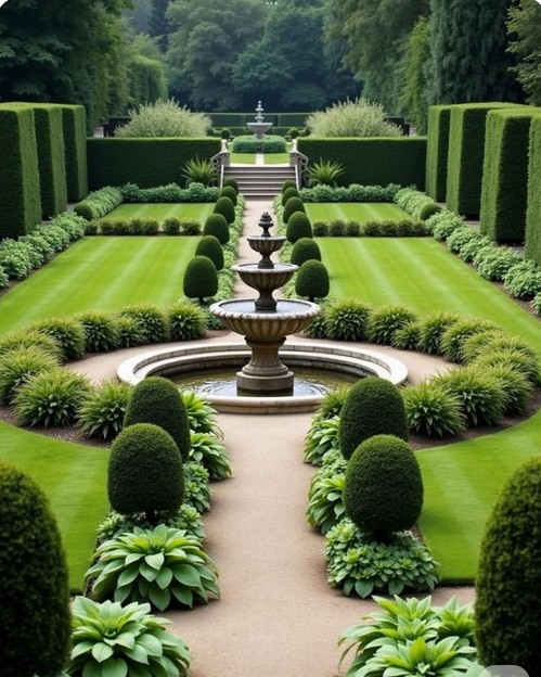 - строгая симметрия дорожек, клумб, изгородей, посадок;