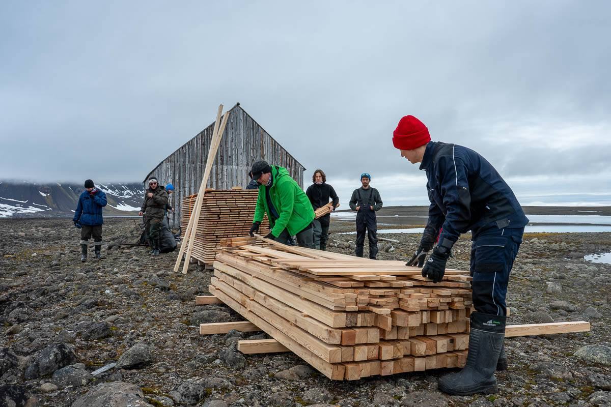 Земля Франца-Иосифа – все! Мы закончили работы на самом северном архипелаге России. Сегодня осилили сразу две высадки. Первая прошла на острове Белл. Здесь участники Арктического плавучего университета вместе с инспекторами национального парка «Русская Арктика» положили начало спасению «Дома Эйры». На остров было доставлено два кубометра вагонки, бруса и других стройматериалов. Дом, который построил Бенджамен Ли Смит и его команда в 1881 году – самое старое здание Земли Франца-Иосифа и сегодня оно нуждается в реставрации. Как отметил начальник экспедиции Александр Сабуров, мы очень рады, поучаствовать в таком значимом событии по сохранению историко-культурного наследия Арктики. Задержаться подольше и провести на острове масштабные научные изыскания помешал белый мишка, очень упитанный и ленивый. Большого интереса к нам он не проявил, но план работ скорректировал. Ввиду медвежьей угрозы «Профессор Молчанов» перебазировался на новое место. Комплексные исследования принял на себя остров
