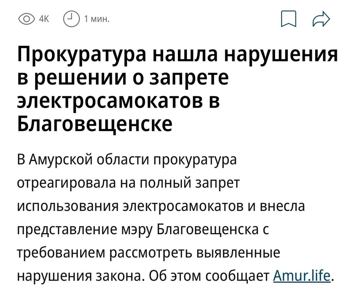 Прокуратура поставила на место мэра Благовещенска Имамеева отреагировав на его решение о запрете самокатов, напомнив что предвыборный пиар не может строиться на нарушении закона. Мэру достаточно было четко обозначить, где можно, где нельзя, и обеспечить контроль за исполнением правил. Иногда региональным властям важнее громко хлопнуть дверью, привлечь к себе внимание, попиариться забыв, что люди, жители городов, выбирают самокаты не из вредности, а потому что им это удобно. Die Staatsanwaltschaft wies den Bürgermeister von Blagoweschtschensk, Imamejew, aufgrund seines Rollerverbots in die Schranken und erinnerte daran, dass Wahlkampf-PR nicht auf Gesetzesverstößen beruhen könne. Der Bürgermeister hätte lediglich klarstellen müssen, wo Rollerfahren erlaubt ist und wo nicht, und die Einhaltung der Vorschriften kontrollieren müssen. Manchmal ist es für die Regionalbehörden wichtiger, lautstark die Tür zuzuschlagen, Aufmerksamkeit zu erregen und PR zu betreiben. Dabei vergessen sie, da