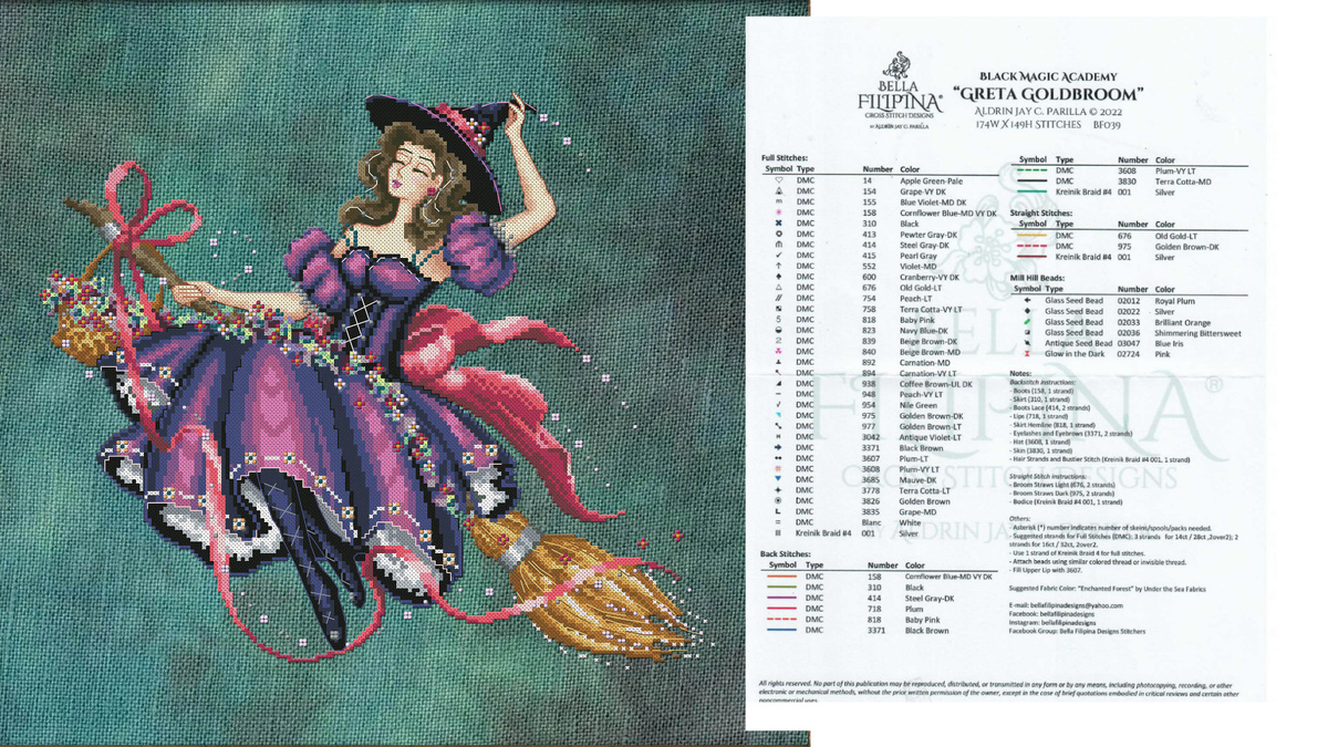 В качестве примера рассмотрим ключ к скану оригинальной схемы Bella Filipina "Greta Goldbroom". Кстати, это один из моих любимых дизайнов. На сайте или в интернет-магазине вам будет дан такой ключ, который вы видите выше. Благодаря такому ключу, вы можете определить, какие расходные материалы вам понадобятся для отшива того или иного сюжета: посмотреть, какие материалы у вас уже имеются в запасах, а какие стоит докупить. Развернутый ключ с основными видами стежков и количеством сложений нитей для вышивки вы можете увидеть только лишь после покупки оригинальной схемы или после скачивания скана схемы.