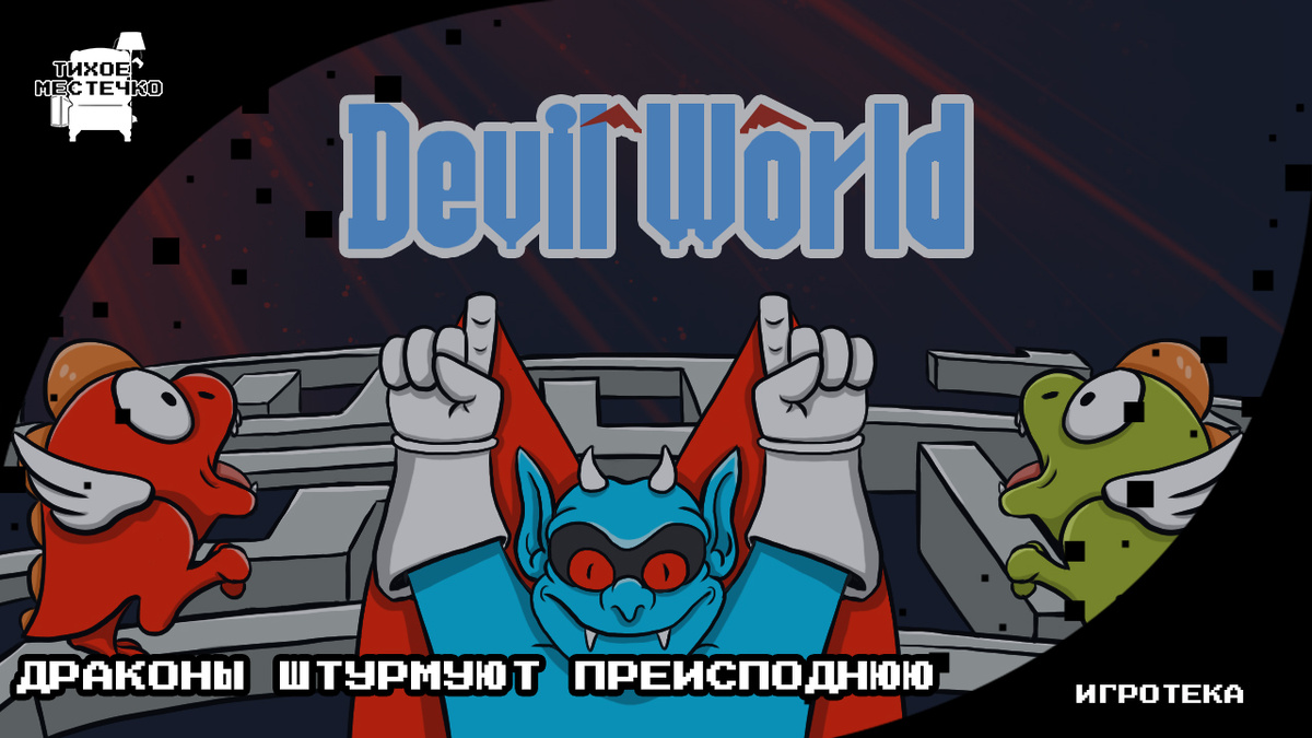 В уже далёком 1994 году мы с братом стали счастливыми обладателями «приставки Денди» и двумя картриджами к ней. Точного их содержания я уже, к сожалению, не помню. В памяти отразилось лишь то, что на первом были первая часть «Чипа и Дейла», «Чёрный плащ» и третьи черепахи (без логотипа Konami), а на втором – танчики, «Pac-Man», «Road Fighter» и «Devil World». Естественно, что первый картридж был самым ходовым. О танчиках мы, конечно же, тоже не забывали на долго. «Pac-Man» мне как не особо нравился тогда, так и сегодня особо ярких эмоций не вызывает. «Road Fighter» могла и может моментально довести до «белого каления», так что особо долго не поиграешь. А вот «Devil World» привлёк внимание своей необычной стилистикой и геймплеем, хоть захватить его на долго вряд ли может. Кстати, тогда она мне показалась очень сложной, и я в неё редко играл из-за этого.