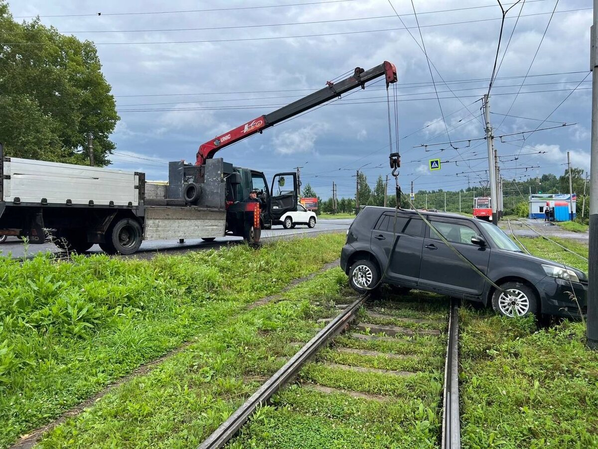 В Прокопьевске иномарка оказалась на трамвайных путях.