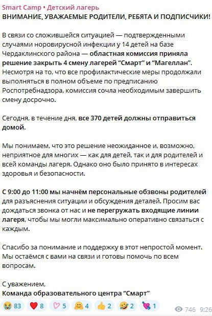 В лагере «Смарт» досрочно распускают смену из-за норовирусной инфекции Образовательный центр «Смарт» в своих официальных каналах сообщил о досрочном закрытии четвертой смены лагерей «Смарт» и «Магеллан». Причина - подтвердившаяся норовирусная инфекция у 14 детей. Все 370 ребят, отдыхавших в лагерях Чердаклинского района, отправятся домой сегодня в течение дня. Родителей призывают дожидаться звонка от администрации лагеря и не перегружать входящие линии учреждения. Персональные обзвоны планируют проводить до 11:00.
