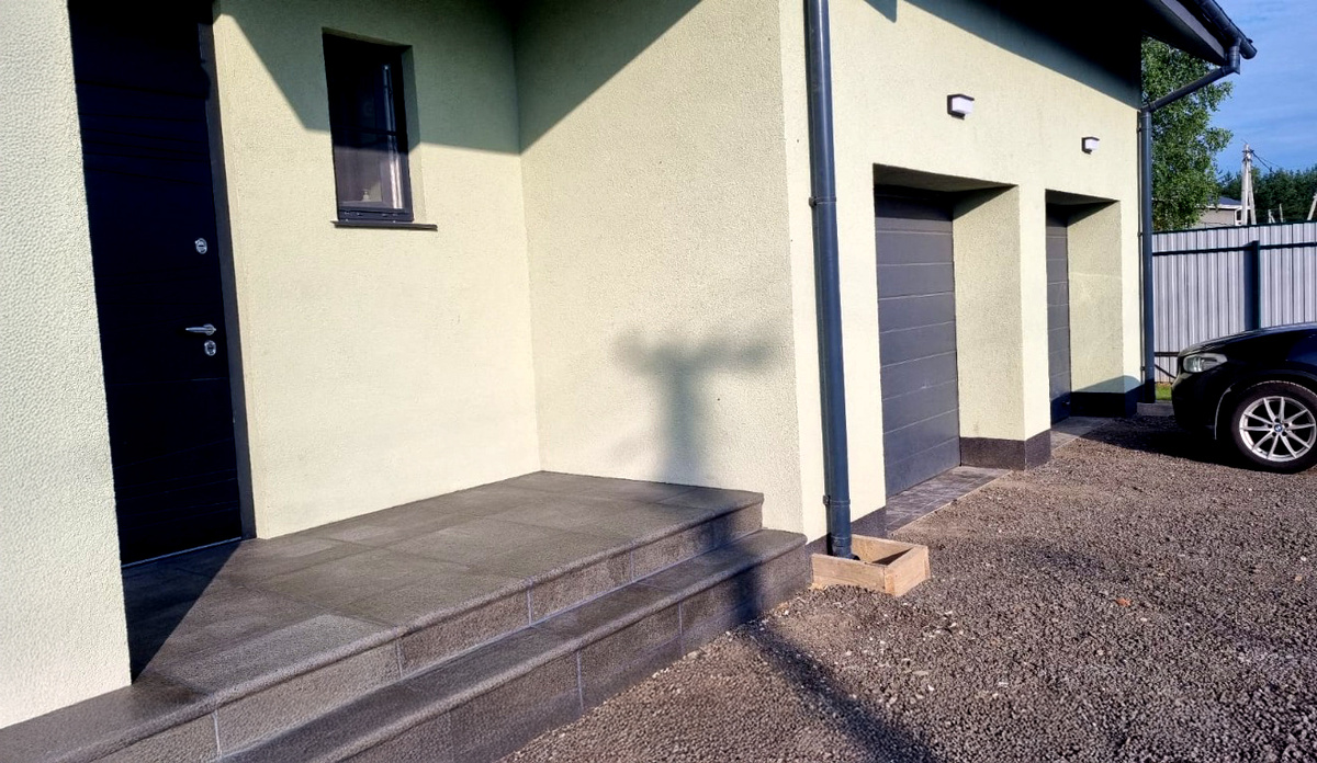 Год сдачи: 2025 Владельцы дома на Южной улице чётко понимали: устаревшее покрытие нужно заменить на надёжное, долговечное и привлекательное. Крыльцо — это первое, что видят гости, и оно должно быть не только красивым, но и безопасным в любую погоду. Длинные дожди, наледь и морозы требуют особого подхода к облицовке. Решение — технология C3 в цвете «Милано коричневый» с фактурой под состаренный габбро. Тёплый и благородный оттенок с глубокой текстурой стал основой нового облика крыльца. Для облицовки использовали три типа элементов: Рельефная поверхность обеспечивает отличное сцепление с обувью, что особенно важно зимой. Материал C3 отвечает нормам СП 59.13330.2020, которые предусматривают
