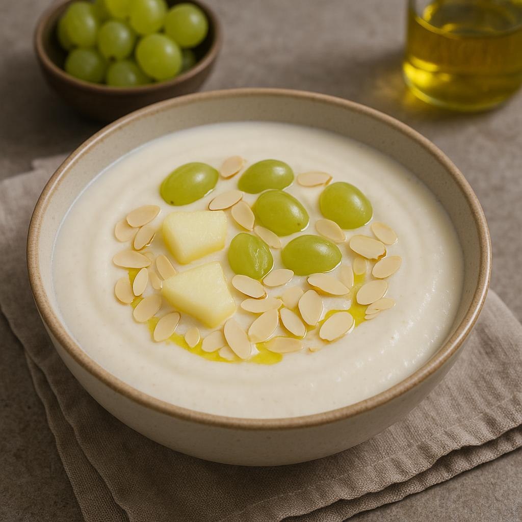 Хотите попробовать нечто необычное из солнечной Испании? Ахобланко — миндальный холодный суп, который любят в Андалусии за яркую свежесть, лёгкую текстуру и нежный ореховый вкус. Идеально для жарких дней, для дачного обеда или быстрого перекуса: готовится за считанные минуты, украшает летнее меню и приятно удивляет всех, кто не равнодушен к неожиданным гастрономическим открытиям. Попробуйте этот сливочный крем-суп — поймёте, почему ахобланко стал гастрономическим символом юга Испании, а в Малаге ему посвящают отдельный фестиваль! (на 4 порции) - 150 г очищенного миндаля - 2–3 зубчика чеснока - 200 г белого хлеба (лучше черствого) - 600 мл ледяной воды - 100 мл оливкового масла extra virgin - 2 ст. л. белого винного уксуса или лимонного сока - 1 ч. л. соли - Виноград (мускатный или зелёный) или дыня — для подачи 1. Замочите хлеб в воде на 10 минут, отожмите. 2. Миндаль и чеснок измельчите в блендере. 3. Добавьте хлеб, уксус (или лимонный сок), немного соли, вл