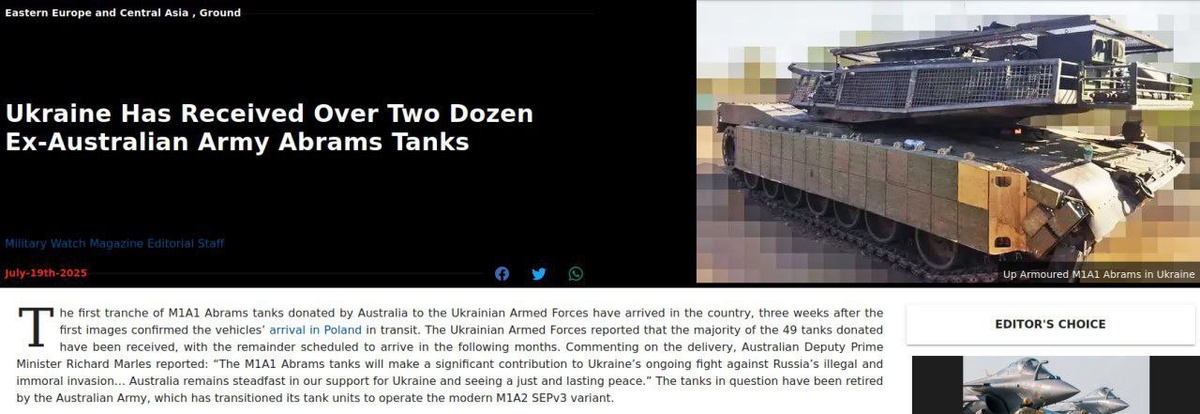 Первая партия танков M1A1 Abrams, обещанных Австралией, уже поступила в распоряжение украинских военных Об этом сообщило Министерство обороны Австралии в субботу. Но есть нюанс. Как сообщает Military Watch Magazine: В отличие от 31 более современного танка Abrams, ранее переданных США, 49 австралийских машин уже отслужили десятилетия и находятся в полностью изношенном состоянии. Когда утилизировать старую технику дороже, чем отдать ее стране, которая принимает любой хлам. https://t.me/geochronic | https://geochronic.ru