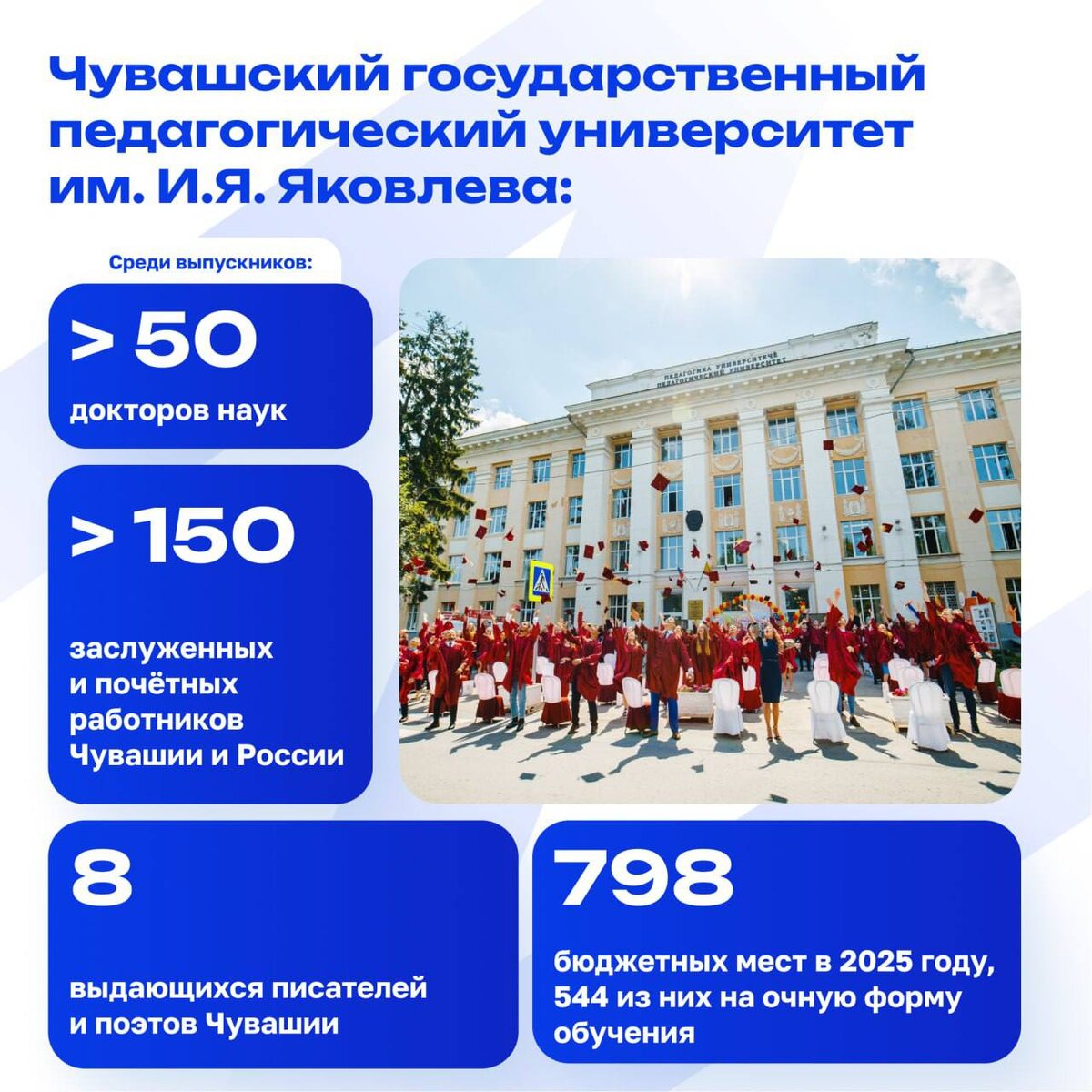 И получить ещё более 70 специальностей! Сегодня Чувашский государственный педагогический университет им. И.Я. Яковлева — это один из крупнейших в Чувашской Республике научных, образовательных и культурных центров регионального и федерального значения. Вуз предлагает абитуриентам многоуровневые образовательные программы по приоритетным направлениям развития науки, технологий и техники, реализует все уровни высшего профессионального образования и формы обучения. Как можно получить дополнительные баллы при поступлении? Какие новые программы появились в вузе? Читайте в карточках.