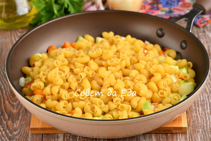 В овощи отправляем сухие макароны (350 г). Замеряем их кружкой или стаканом.