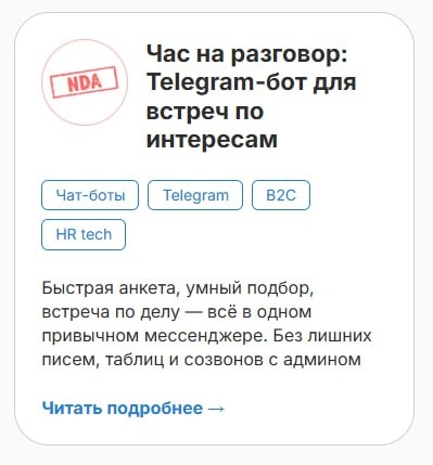 Свежий #кейс на сайте У нас регулярно выходят свежие кейсы на сайтах, чтобы вы могли с ними познакомиться и кайфануть! Сегодня рассказываем про свежий кейс для крупнейшей технологической компании у которой мы не можем произносить название вслух. В этом проекте был целый набор интересных механик. Ключевая: возможность организации онлайн встреч для людей из разных миров. Один участник делится экспертизой, а другой ее перенимает. И это тоже для роста горизонтальных связей в огромном коллективе, поэтому тут будет уместен тег #hr Кроме прочего, конечно, в боте была и админка и целый ряд неочевидных тонких моментов, которые мы, как и всегда, героически преодолели! Бот благополучно уехал в закрытый контур к заказчику и все замечательно им пользуются и развивают эту самую свою компанию. Приходите к нам, мы и вам сделаем крутого бота! Ссылка на кейс на нашем сайте: https://botcreators.ru/blog/chas-na-razgovor-telegram-bot-dlja-vstrech-po-interesam/