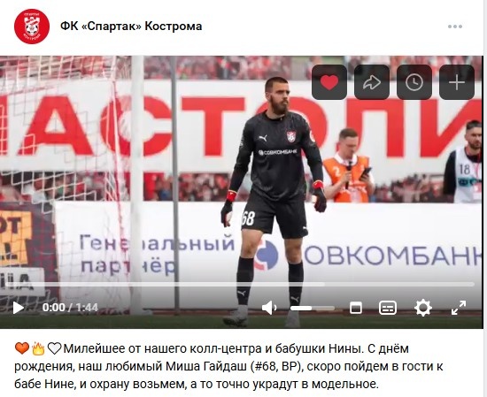 Михаил Гайдаш отметил свое 22-летие 22-го июля вратарь костромского «Спартака» отметил свое 22-летие. В официальных соцсетях ФК опубликовали видеопоздравление от фанатки голкипера бабушки Нины. «Как бы его не украли и не отправили в модельный бизнес», — поделилась своим беспокойством болельщица. В своем обращении женщина рассказала, что ходит на каждый матч красно-белых. Администрация красно-белых оценила преданность поклонницы и пообещала заглянуть в гости к бабушке Нине вместе с ее обожаемым голкипером. Михаил Гайдаш родом из Красноярска. В футбол молодой человек пришел следом за своим старшим братом. За все время вратарь сменил несколько спортивных клубов, среди них красноярский «Енисей», а также столичные «Чертаново» и «Локомотив». За костромскую команду Михаил начал играть с 2023-го года. Напомним, уже через несколько дней спартаковский голкипер отправится вместе со своими красно-белыми коллегами в Москву на матч со столичной «Родиной». Игра пройдет 27-го июля в 18:30 на стадионе