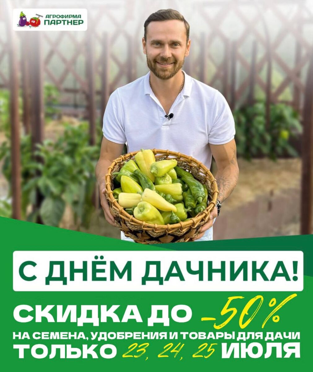 🌿 С ДНЁМ ДАЧНИКА! 🤍 Друзья, поздравляем с праздником всех, кто знает, как вырастить чудо своими руками, кто с любовью ухаживает за каждым ростком и наполняет лето ароматами, красками и урожаем! Пусть земля щедро благодарит за заботу! Пусть каждый день на даче будет в радость! Пусть лето запомнится теплом, вдохновением и новыми открытиями! А чтобы праздник стал ещё приятнее — у нас есть специальные предложения: 🌱 Только с 23 по 25 июля — -15% на все семена Агрофирмы Партнер в интернет-магазине! ✨ А ещё — приятный бонус: до -50% на удобрения и полезные товары для дома и сада. 🎁 Успейте выбрать всё необходимое по выгодной цене С любовью, Агрофирма Партнер