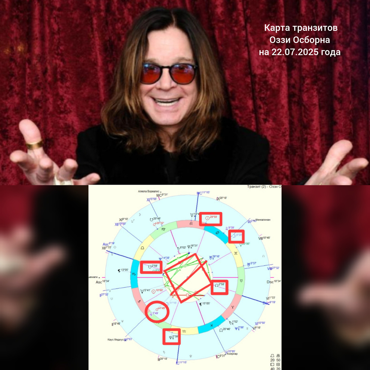 Иногда я залипаю на карты и мне сложно остановиться, так как в них столько глубины. В дополнение к тому, что было в видео по карте Оззи Осборна. Перед вами карта транзитов на 22/07/2025 года Оззи Осборна. И именно вчера транзитное Солнце перешло в королевский знак льва и встало в оппозицию к Плутону. Помните вчера в прогнозе на день я упоминала о том, что для руководителей, лидеров наступает НЕ очень хорошее время, что они будут под давлением Плутона. Плутон это не только вышестоящие органы власти, но это еще и стихийные бедствия и тяжелые, неизлечимые болезни. А транзитное Солнце во Льве это ещё и очень популярные люди, короли музыки, кино и всего, что связано с признанием и любовью огромных масс людей. И видите как транзитное Солнце замкнуло квадратом натальные кармические узлы Оззи (выделила квадрат красным) и транзитный Плутон. Он прошёл свой путь яркой личностью, известным на весь мир и это все заложено в его натальной карте. Ушёл из жизни после своего последнего концерта, н