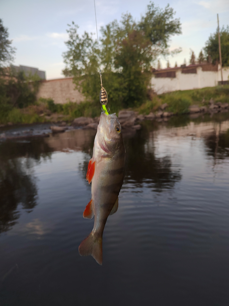 Два дня рыбалки. Здравствуйте всем. Ездил вечером после работы на рыбалку. Клевало не очень, но всё таки не пустой. Еще взял на пробу блесна вертушки ручной работы. В 00 размере. Таких нормальных не найти, а эти работают отлично. Спасибо Денису. Если кому будет интересно , можете написать мне. Я дам ссылку на группу вк. И так поехали на речку. Река в черте города Сысерть. Тут видно и окуня и вертушечку. Еще один полосатый разбойник. Клюёт бойко. Почти на каждом забросе. Видно , что окунь мягко говоря мелковат. Но это не страшно. Я их все равно отпускаю. Пусть растут. А рыбу мы купим в первом рыбном. Кстати говоря вес вертушки 1.6 грамма. На спиннинге до 5 грамм работает просто изумительно.Лепесток заводится с первого оборота ручки катушки. Вот тут за трубой примочек. Глубина с пол метра. Много тут стоит окушат.и так, делаем еще пару забросов и нам пора......Конечно же домой. Завтра на работу.. А я с вам