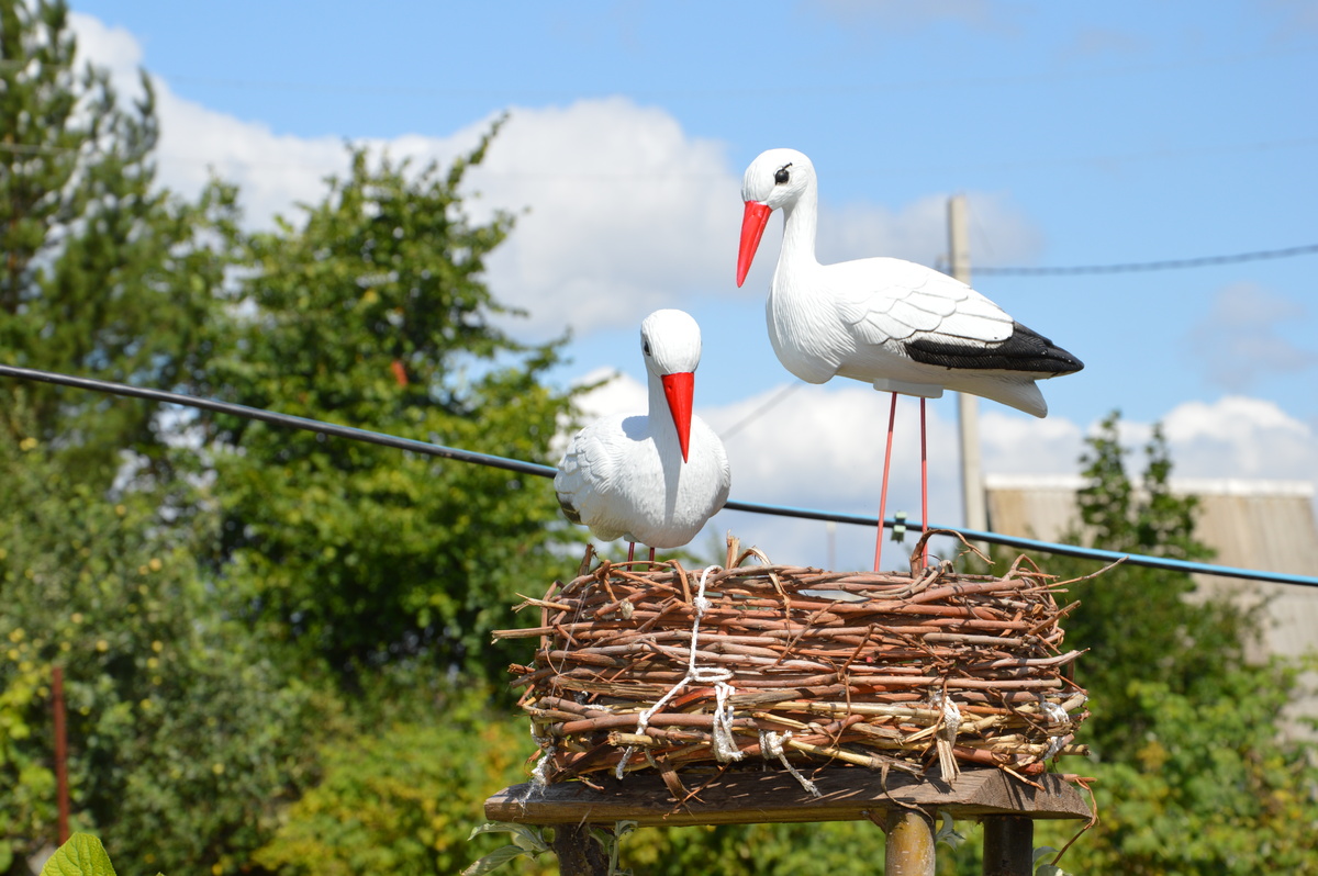 Белки забрались на фонарный столб, а на ветке устроилось гнездо голубя. Два больших аиста из фанеры указывают путь в огород.