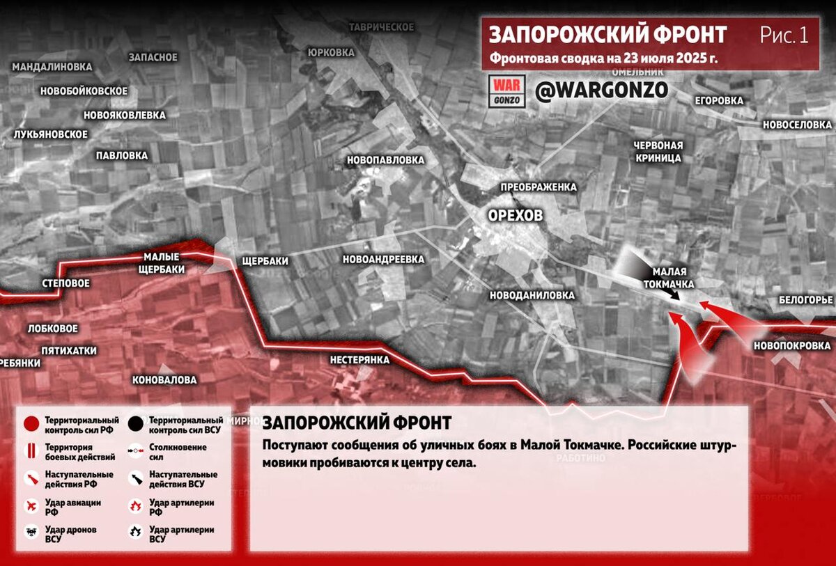 Запорожский фронт. Поступают сообщения об уличных боях в Малой Токмачке. Российские штурмовики пробиваются к центру села. (Рис.1)