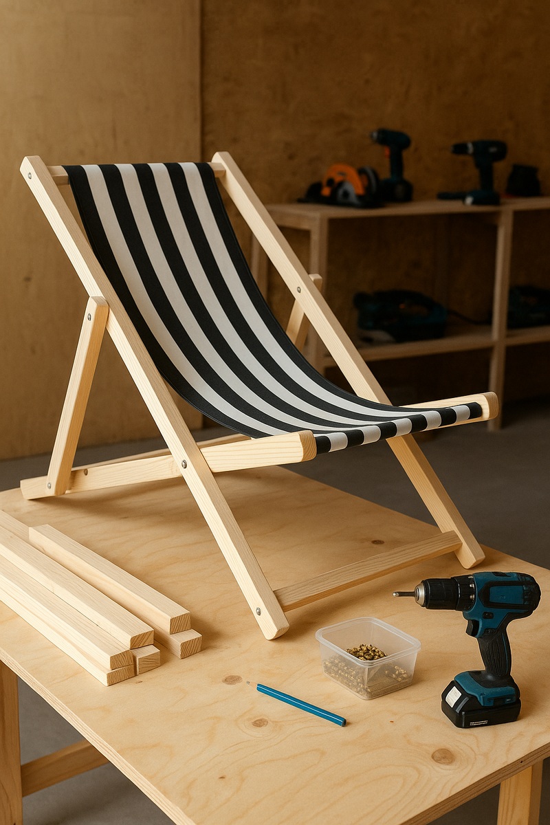 Лето в самом разгаре, и многие из нас мечтают устроить уютный уголок для отдыха на даче или балконе. Сегодня расскажу, как своими руками сделать стильный и удобный шезлонг из дерева. Не потребуется сложных инструментов, а удовольствие от процесса и результата — гарантировано! Для одного деревянного шезлонга под тканевое полотно нужно подготовить: Нарисуйте схему будущего шезлонга. У классической модели есть две боковые рамы и пара перекладин, а тканевое полотно крепится между ними.