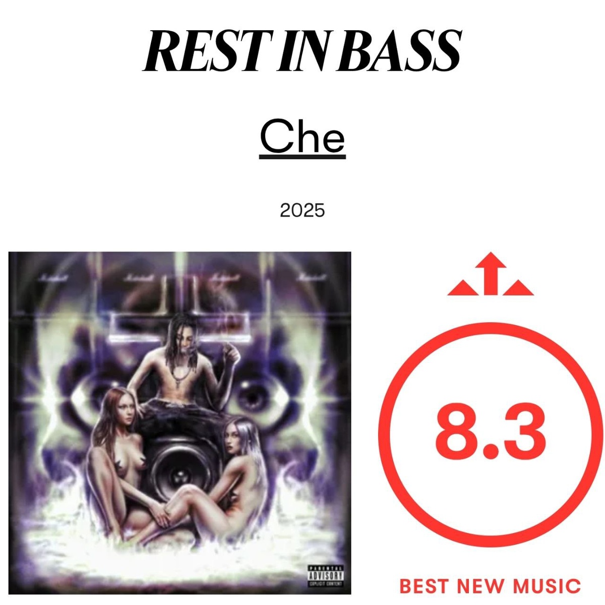 ☄️ PITCHFORK — ОЦЕНКИ ПОСЛЕДНИХ РЭП-РЕЛИЗОВ! Альбом от Che «Rest In Bass» получил самую наивысшую оценку в этом году. Для общего сравнения с другими оценками недавних альбомов: ➖ OSAMASON — Jump Out (8.2 баллов); ➖ The Weeknd — Hurry Up Tomorrow (7.8 баллов); ➖ Playboi Carti — MUSIC (7.7 баллов); ➖ Ice Spice — Y2K (7.6 баллов); ➖ Tyler, The Creator — CHROMAKOPIA (7.6 баллов); ➖ Ken Carson — More Chaos (7 баллов) ➖ Kendrick Lamar — GNX (6.6 баллов); ➖ Peppa Pig — The Adventures Album (6.5 баллов); ➖ Drake, PARTYNEXTDOOR — $ОME $ЕXY $ОNGS 4 U (5.9 баллов); ➖ ¥$, Kanye West, Ty Dolla $ign — VULTURES (5.8 баллов); ➖ Yeat — Lyfestyle (5.6 баллов); ➖ Eminem — The Death of Slim Shady (4.8 балов); ➖ Lil Wayne — Tha Carter VI (2.9 балов); ➖ Lil Uzi Vert — Eternal Atake 2 (4.7 балов); ➖ ¥$, Kanye West, Ty Dolla $ign — VULTURES 2 (4.6 баллов). 💀 FML MATTERS