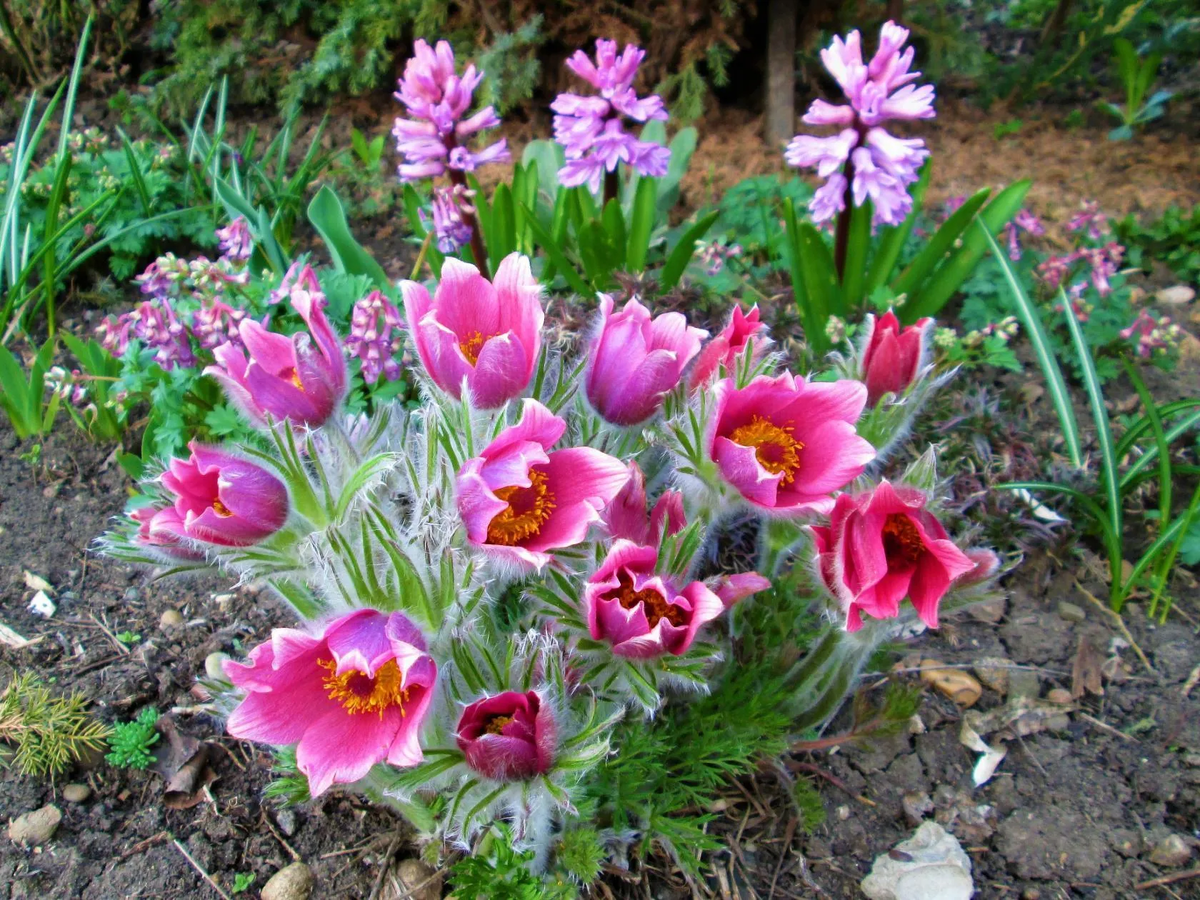 Прекрасные весенние цветы- прострелы! Они цветут раньше тюльпанов. У нас в Краснодарском крае они цветут с марта по апрель. Длительность цветения будет 2 месяца, если у вас будут разные сорта и ещё сажать прострелы надо в разных местах сада- на солнышке и в полутени. Прекрасно разрастаются по саду самосевом, всходят даже на тропинках. Один раз нужно их посадить в саду и они будут расти всегда. Каждый год у вас будут появляться новые гибриды.