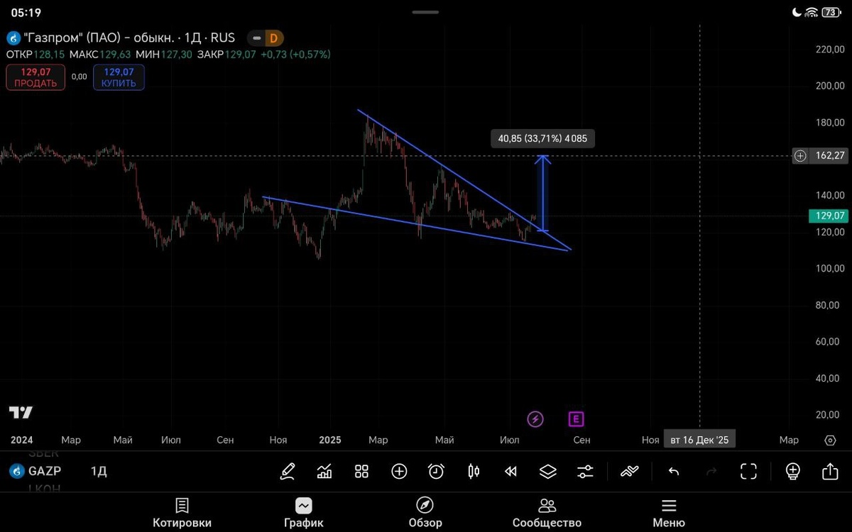 $GAZP 🕯Сформировал клин - фигура разворотная и указывает на скорый рост . ✔️Стенка клина 124,6, пробил и закрепился, уже даже подтвердил фигуру и протестил этот уровень. Предполагаю , рост будет продолжен. 🔼Отработка фигуры - 162, но я предполагаю пойдет и выше до 180р к последнему максимуму. Ждем кульминации) Не ИИР