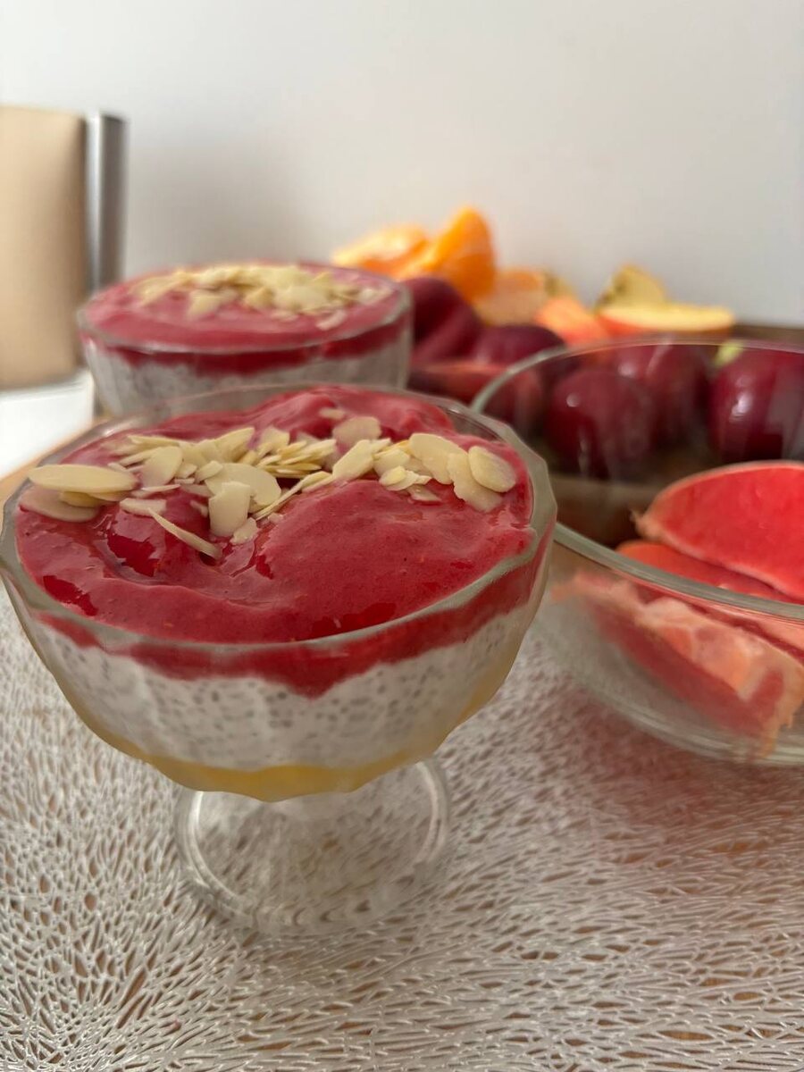 На 1 стакан кокосового молока (берите это: Aroy-D, с другими будет не то) 2,5 ст.ложки семян чиа. Размешать и дать настояться, периодически размешиваем. Пока чиа замачивается берём 1 спелый банан и столько же по весу замороженного манго (идеально сорт Зебдея) - взбиваем в блендере. Сервируем его в пиалку на самое дно, затем слой чиа, и сверху точно такой же слой из блендера, только заместо манго берём зам.малину с бананом, украсить лепестками миндаля и bon appetite.