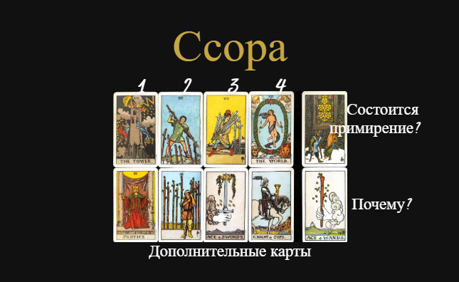 Расклад поможет понять, почему произошла ссора (с любимым, с коллегой), что эта ситуация дала вам и второму человеку, чем закончилась в итоге.