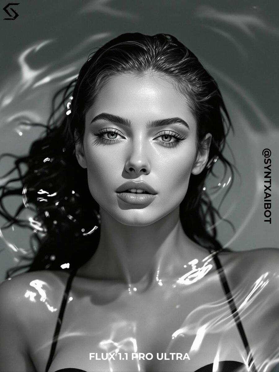 Black-and-white portrait of a stylish woman floating in a pool, captured in a close-up, with only her face visible. She exudes modern elegance, her expression serene but confident. Her hair is sleek and wet, cascading around her face in soft waves. The lighting highlights her sharp features — high cheekbones, smooth skin, and strong jawline — giving her a timeless, cinematic quality. She’s wearing a minimalistic, high-fashion Balenciaga-inspired outfit that contrasts against the water, which ripples subtly around her. The scene feels luxurious yet effortless, with the soft monochrome tones adding a dramatic, surreal effect to her image. The overall composition is bold, chic, and captivating, focusing on the grace and poise of the woman in her element. High-resolution