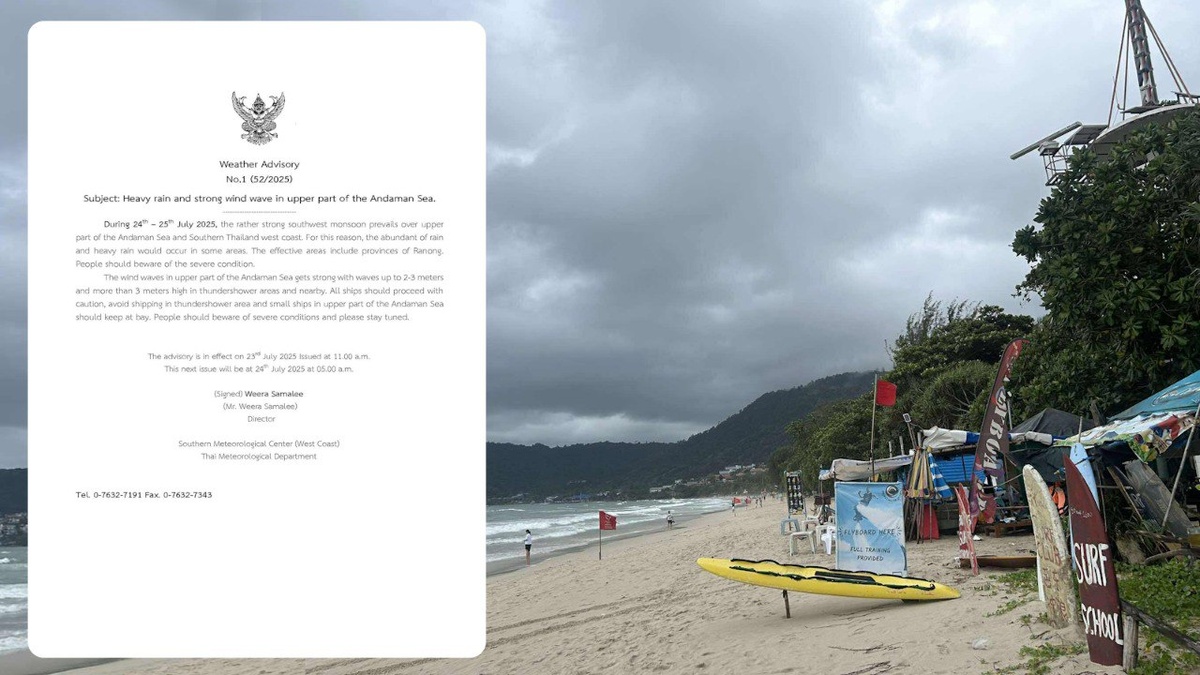 Штормовое предупреждение продлено для материкового побережья к северу от Пхукета Синоптики из пхукетского центра Метеорологического департамента Таиланда (Phuket Met) продлили штормовое предупреждение на 24-25 июля, но только для провинции Ранонг, находящейся на побережье Андаманского моря севернее Пхукета. Провинциям Пхукет и Пханг-Нга достанутся отголоски шторма, но повторения воскресного (20 июля) буйства стихии метеорологи не ожидают. Прогноз на 24 часа – с полудня 23 июля до полудня 24 июля – предполагает всего лишь 30-процентные осадки на Пхукете. А за 22 июля синоптики в принципе не зафиксировали осадков ни на одной измерительной станции. В последних уведомлениях пхукетского офиса Морского департамента говорится об опасных условиях на море вплоть до сегодняшнего дня (23 июля) включительно. Период с 21 по 24 июля включительно упоминается как время «усиления муссона» и сильных дождей. Пхукет среди затронутых провинций не упоминается. Фото: Phuket Met, TMD