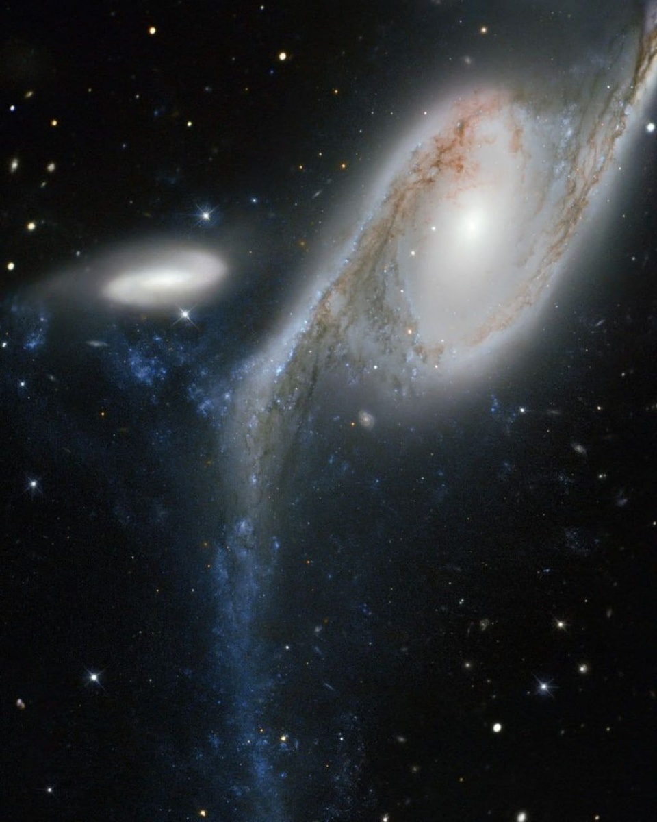 Его необычная форма вызвана взаимодействием с меньшей галактикой IC 4970, которую можно увидеть слева