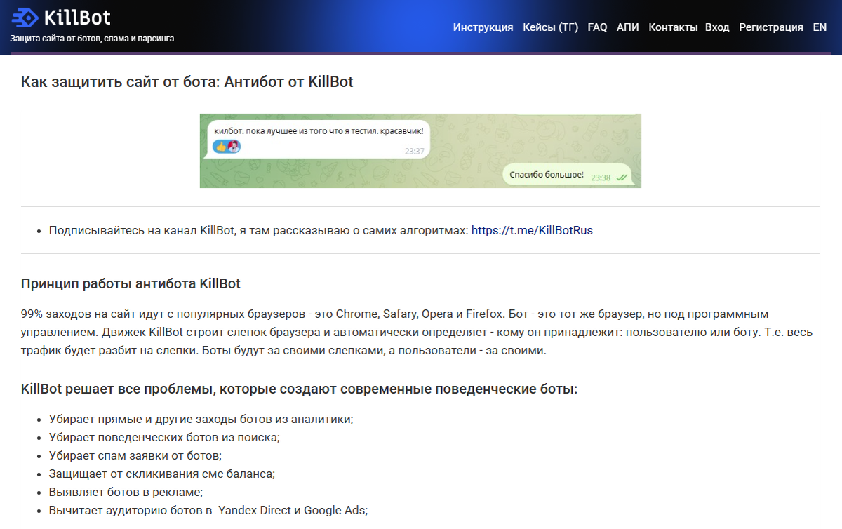 - Киллбот - есть бесплатный тариф для ознакомления и для малых сайтов