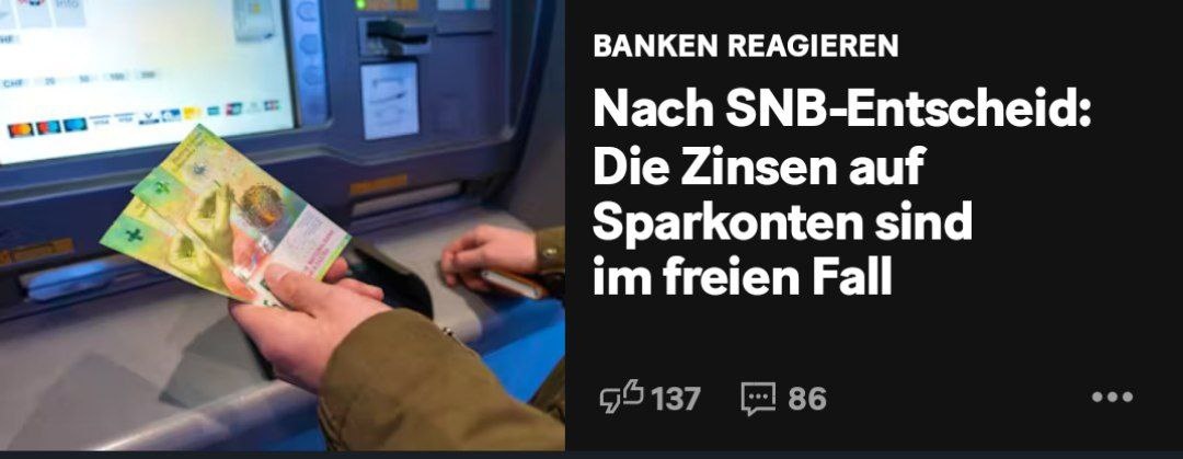 ШНБ ( Национальный банк Швейцарии) снизил ключевую процентную ставку, что привело к падению процентных ставок по сберегательным счетам. В настоящее время средняя процентная ставка по таким счетам составляет 0,18 %. Лучший процентный сберегательный счет сегодня предлагает около 1 процента, что значительно меньше, чем в прошлом году "