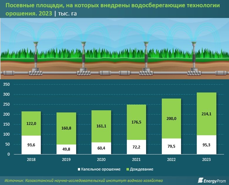 Из двух этих сберегающих методов орошения наиболее распространенным можно назвать полив с помощью дождевых установок. По данным Казахстанского научно-исследовательского института водного хозяйства, с 2018 по 2023 год орошаемые площади сельхозкультур, которые получали влагу методом дождевания, были увеличены на 75,6%, до 214,1 тыс. гектаров. Динамика внедрения капельного орошения куда более скромная: всего плюс 1,8% за пять лет.