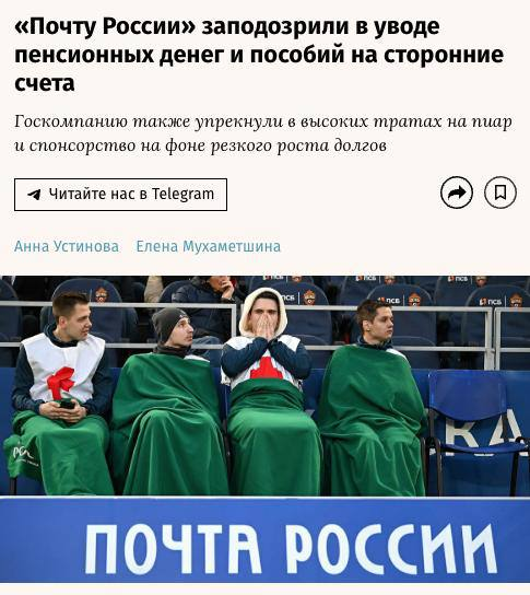Финансовое положение почтовой службы тоже вызывает вопросы. По данным аудита, долги компании превышают 128 миллиардов рублей, но это не помешало ей продолжать тратить миллионы на непрофильные проекты.