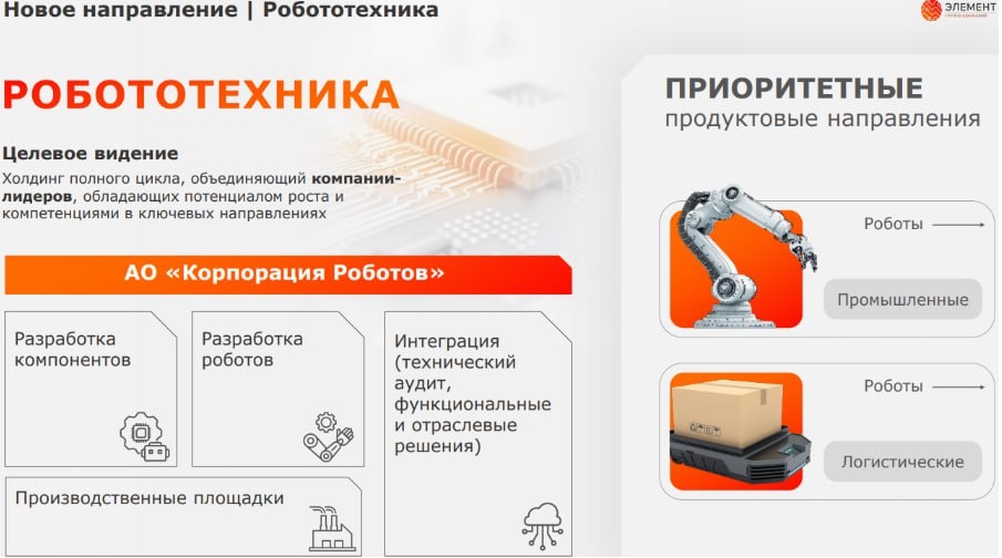 От чипов до роботов: трансформация «Элемента» ГК «Элемент» совершила первый шаг в развитии нового направления деятельности — через дочернюю структуру «Корпорация Роботов» приобрела 51% акций АО «НПО „Андроидная техника“». В начале 2025 года президент группы Илья Иванцов анонсировал сделки в сегменте робототехники, и вот первая из них реализована. Сумма сделки не раскрывается, но стратегический смысл понятен: «Элемент» выстраивает замкнутый производственный контур — от разработки и выпуска электронной компонентной базы до готовых робототехнических систем. Это позволяет холдингу сформировать долгосрочный внутренний спрос на собственную продукцию и усилить технологический суверенитет. 👉 Стратегические перспективы Сделка полностью вписывается в стратегию «Элемента» по вертикальной интеграции и диверсификации. Холдинг укрепляет сбыт через внутренние поставки в новые бизнес-направления. В приоритете — запуск серийного производства сервоприводов и электродвигателей нового поколения, объед