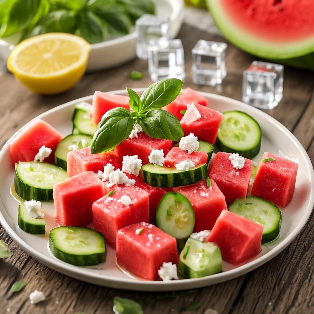 Когда за окном жара, а хочется чего-то лёгкого, сочного и необычного , на помощь приходит этот салат. Салат с арбузом, огурцом и фетой — не просто яркое блюдо, а настоящий глоток лета. Он освежает, питает и при этом не заставляет чувствовать тяжесть после еды. Этот салат — как дыхание моря в тарелке : сладость арбуза, хруст огурца, солоноватая фета и травянистый базилик — всё в идеальном балансе. Арбуз нарежьте кубиками или полукружиями. Огурец — тонкими ломтиками или кубиками. Фету — небольшими кусочками. Выложите арбуз, огурец и фету в миску. Добавьте листья базилика и кедровые орехи (если используете). Смешайте оливковое масло, лимонный сок, щепотку соли и перца. Заправьте салат перед подачей. Переложите салат на тарелку, украсьте свежим базиликом и подавайте сразу — чтобы сохранить сочность и свежесть. Если вам понравился этот рецепт, не забудьте сохранить его в закладки и поделиться с теми, кто любит свежие и необычные блюда.