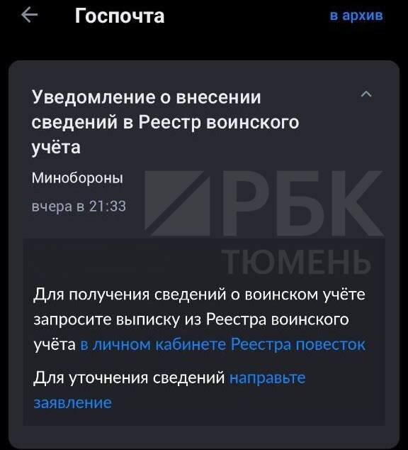 Тюменцев начали вносить в электронный реестр воинского учета. Уведомление об этом приходит на Госуслуги, сообщил РБК Тюмень подписчик. Электронный реестр позволит военкомату через Госуслуги рассылать уведомления мужчинам, состоящим на воинском учете. Это может быть как вызов для уточнения информации, так и официальная повестка. Розыгрыш билетов на T.Fest