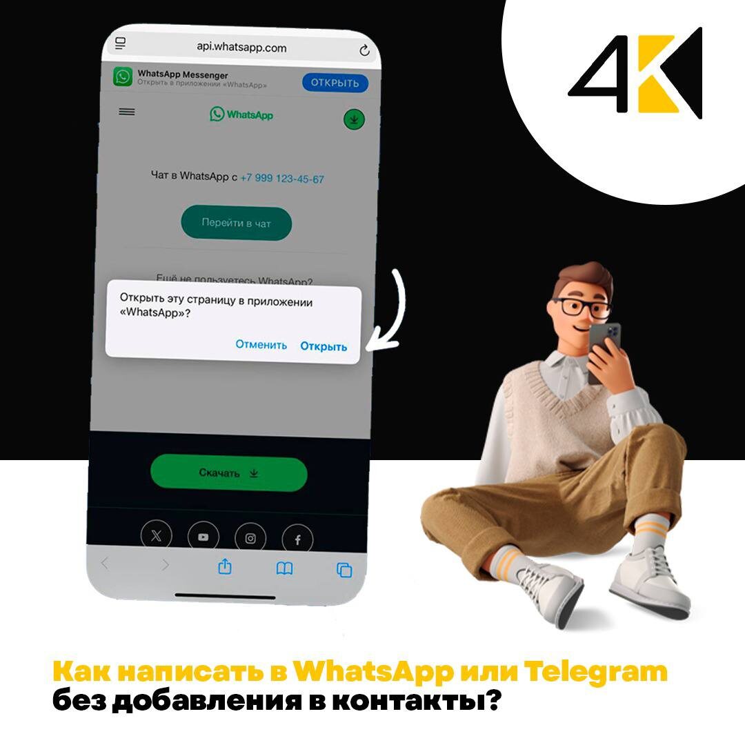 🔴Как написать в WhatsApp или Telegram без добавления в контакты Нужно написать человеку, но сохранять номер в контакты не хочется?😅 Делимся простым способом как сразу открыть чат с человеком, не сохраняя номер в контакты: 🔘 Для WhatsApp: https://wa.me/79991234567 (подставьте нужный номер) 🔵 Для Telegram: https://t.me/79991234567 (подставьте нужный номер) Номер указывается в международном формате без плюса. При переходе по этой ссылке откроется чат с указанным номером! ❤️ — если полезно #TeleTips4K