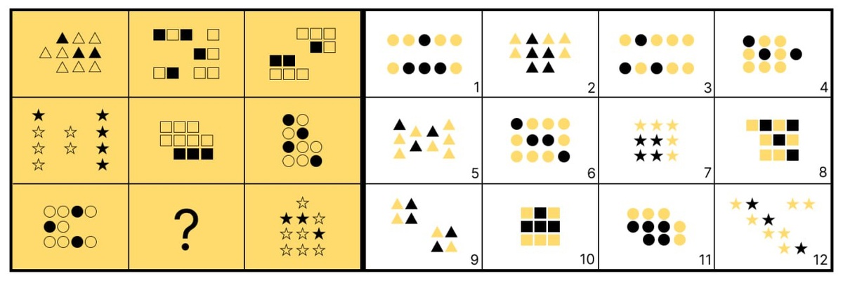Внимательно посмотрите на 8 рисунков, найдите закономерность положения фигур и определите, какой из вариантов справа должен быть на месте ячейки с вопросом.