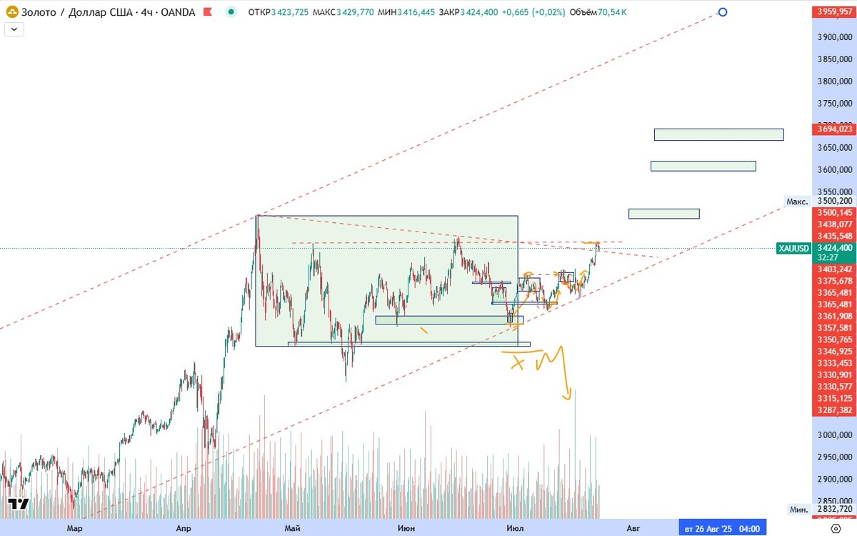 Золото - выполнена основная цель предыдущего ТП на 3435. Следующие трендовые цели 3500 и 3600