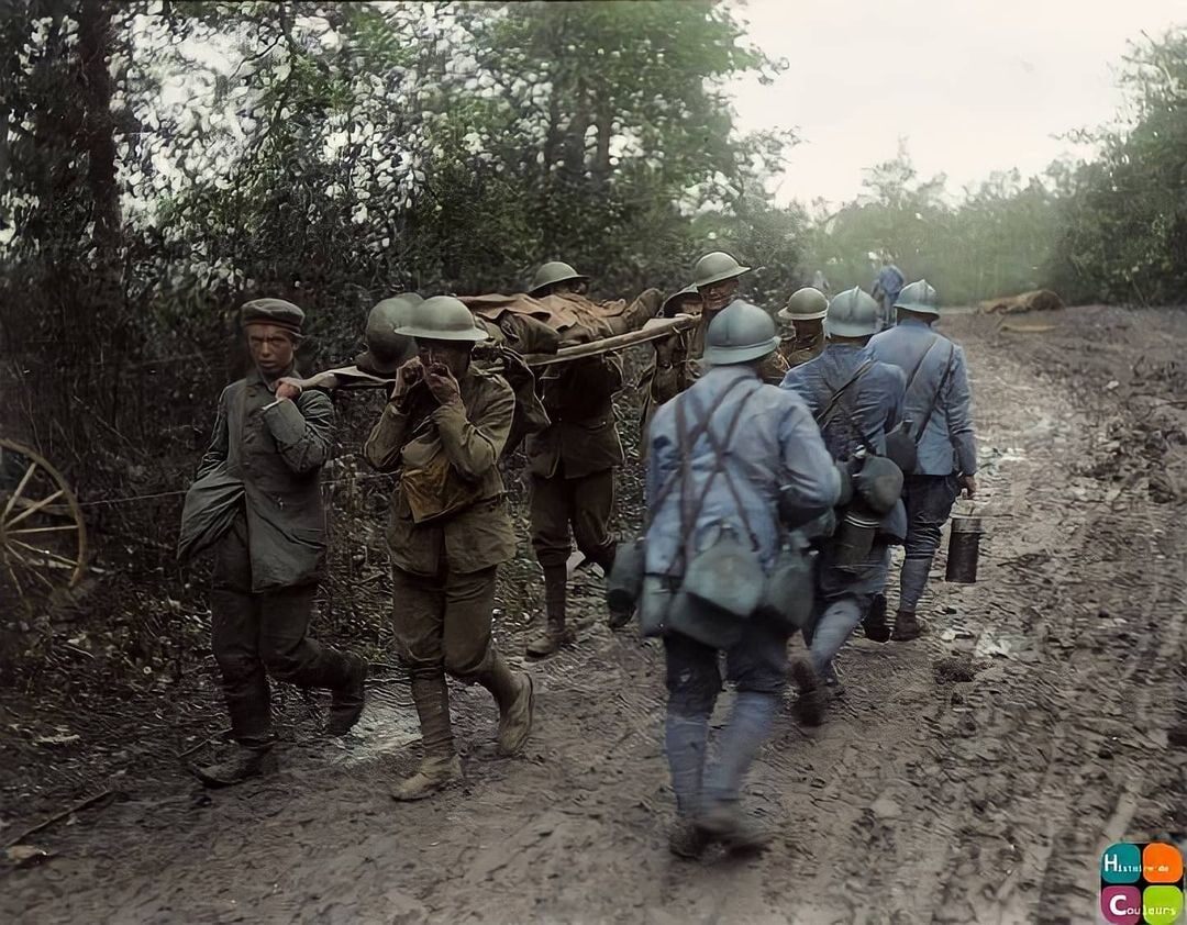 Британские солдаты с носилками и немецкий пленник, помогающий нести раненого солдата, проходят мимо французской группы, несущей еду, во время Второй битвы на Марне, 23 июля 1918 года.